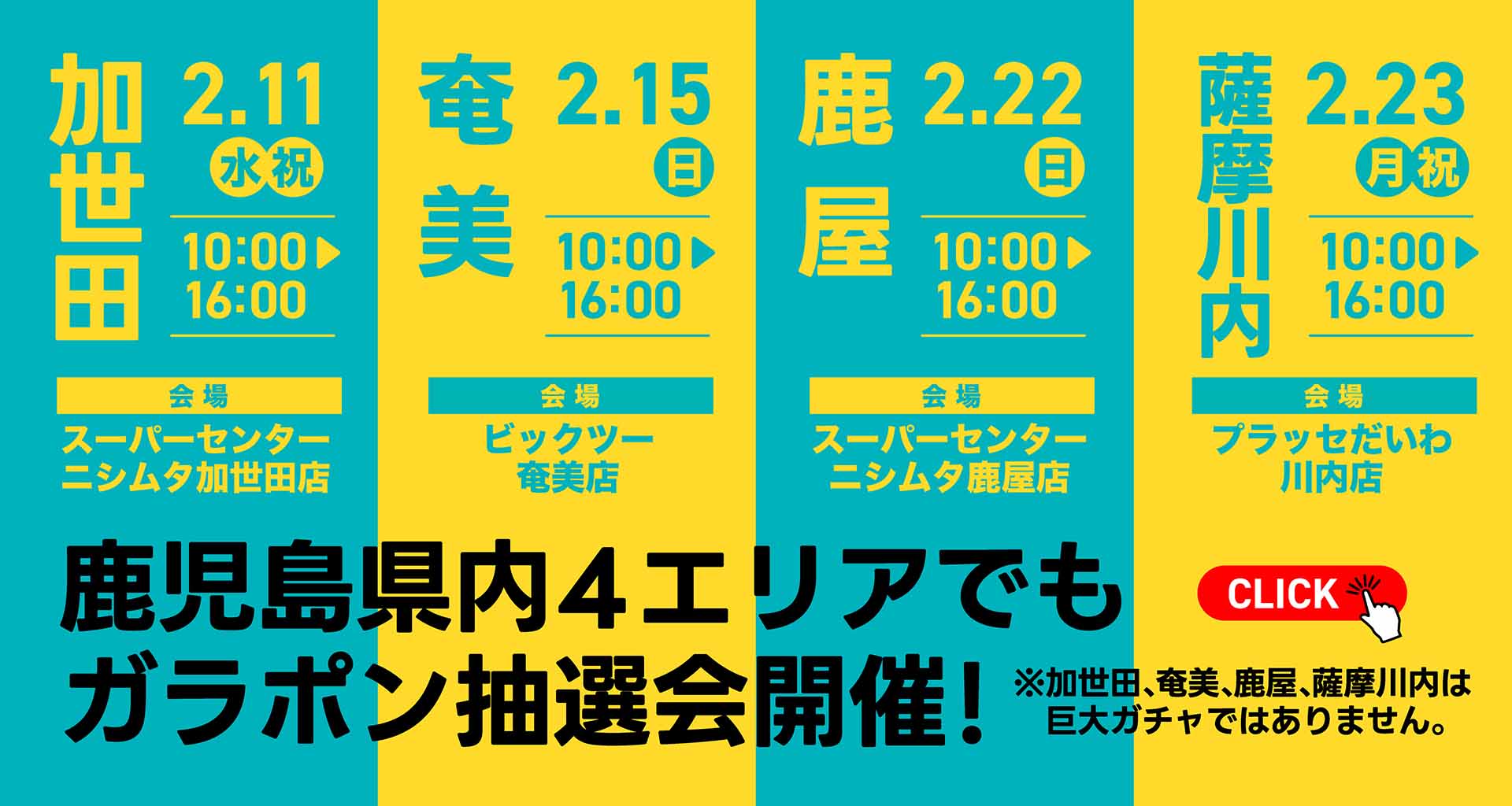 ※加世田、奄美、鹿屋、薩摩川内では巨大ガチャでなくガラポン抽選会となります。